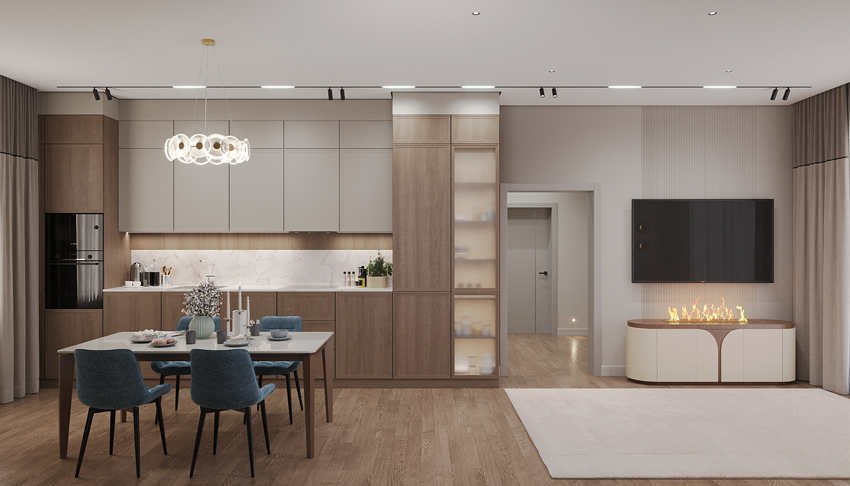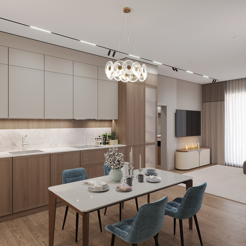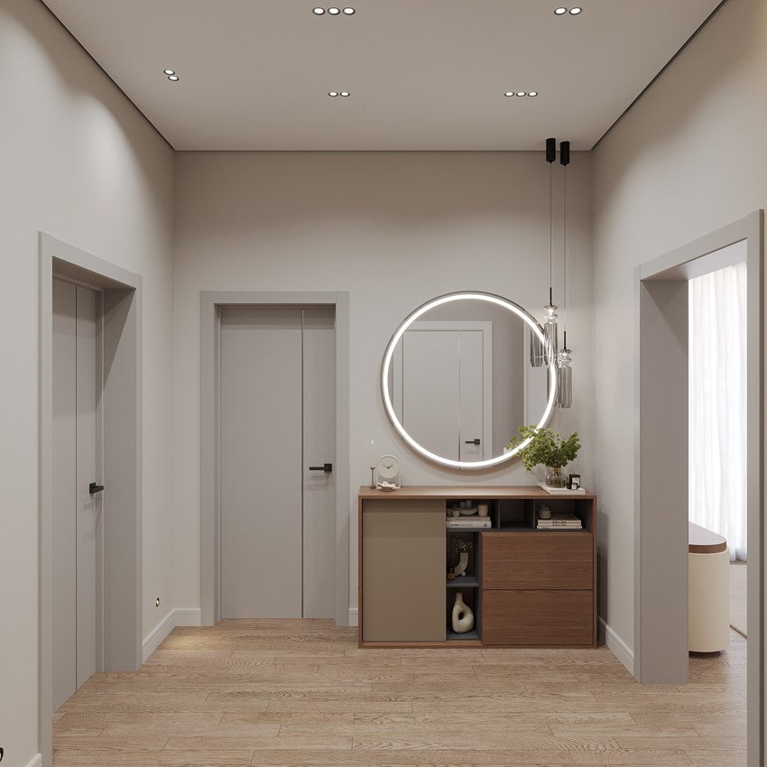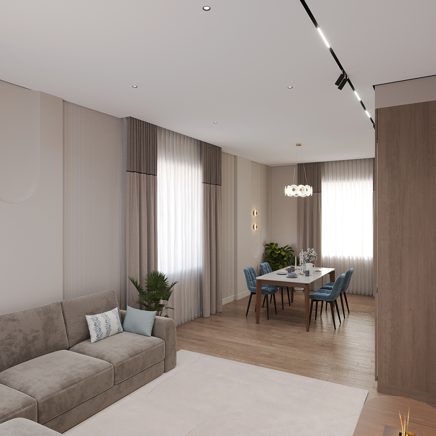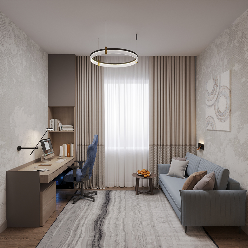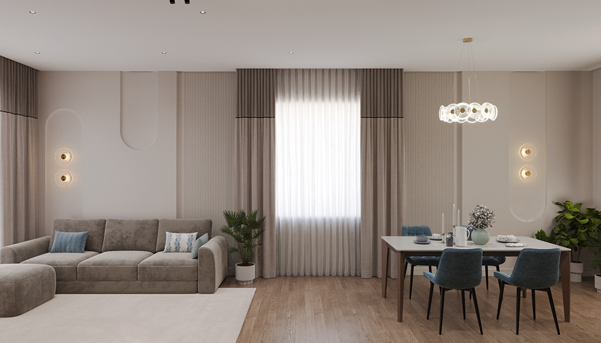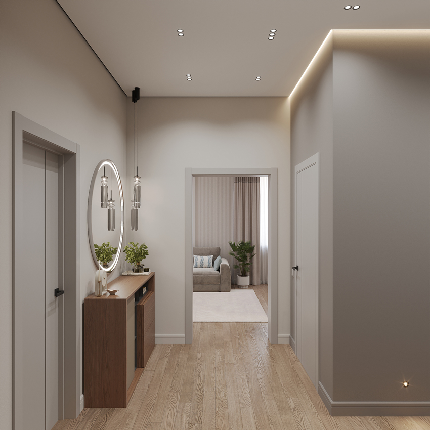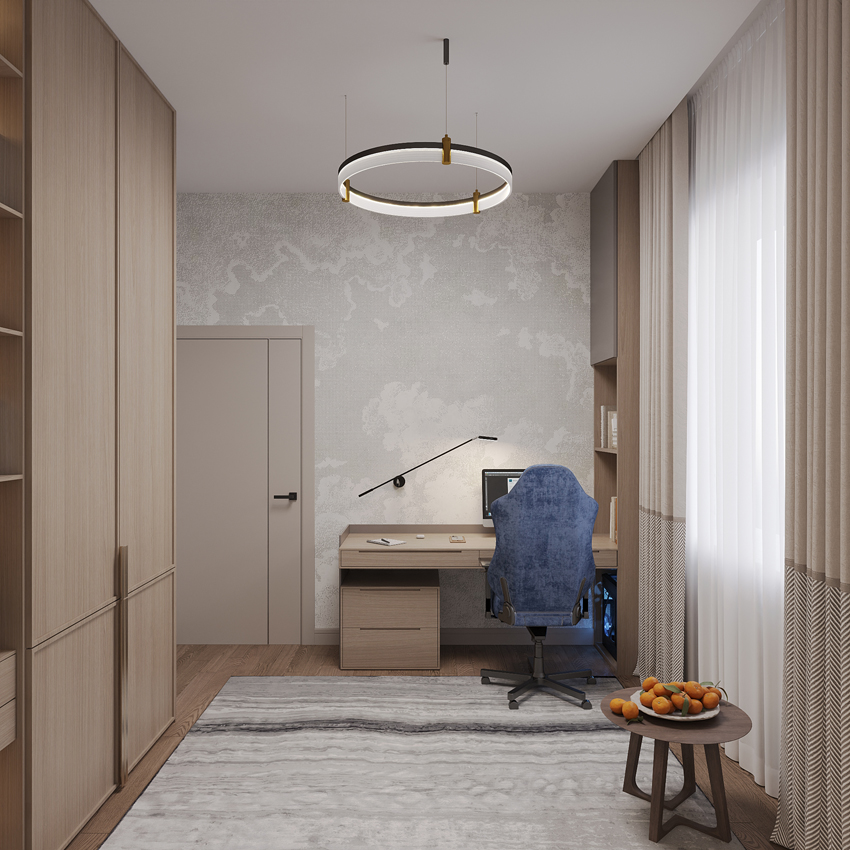Дизайн-проект частного дома для молодой семьи на двоих. В техническом задании — натуральный цвета, современная отделка, мебель и освещение.